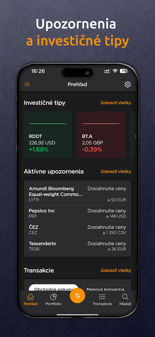 O pripísaní aj výbere finančných prostriedkov a realizácii obchodných pokynov ste okamžite informovaní pomocou SMS. Na cenové upozornenia si môžete nastaviť SMS, e-mailové aj push notifikácie.